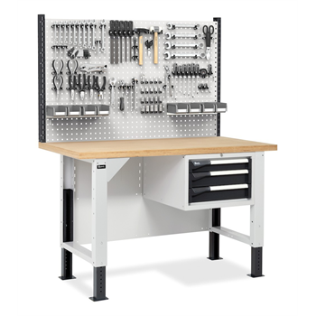 אפשר להוסיף: ארון מגירות במידות והרכב מגירות לבקשת הלקוח, לוחות צד ו/או אחוריים מחוררים לתליית כלים ואביזרים וכן מדפים מתכוונים (גובה וזווית).